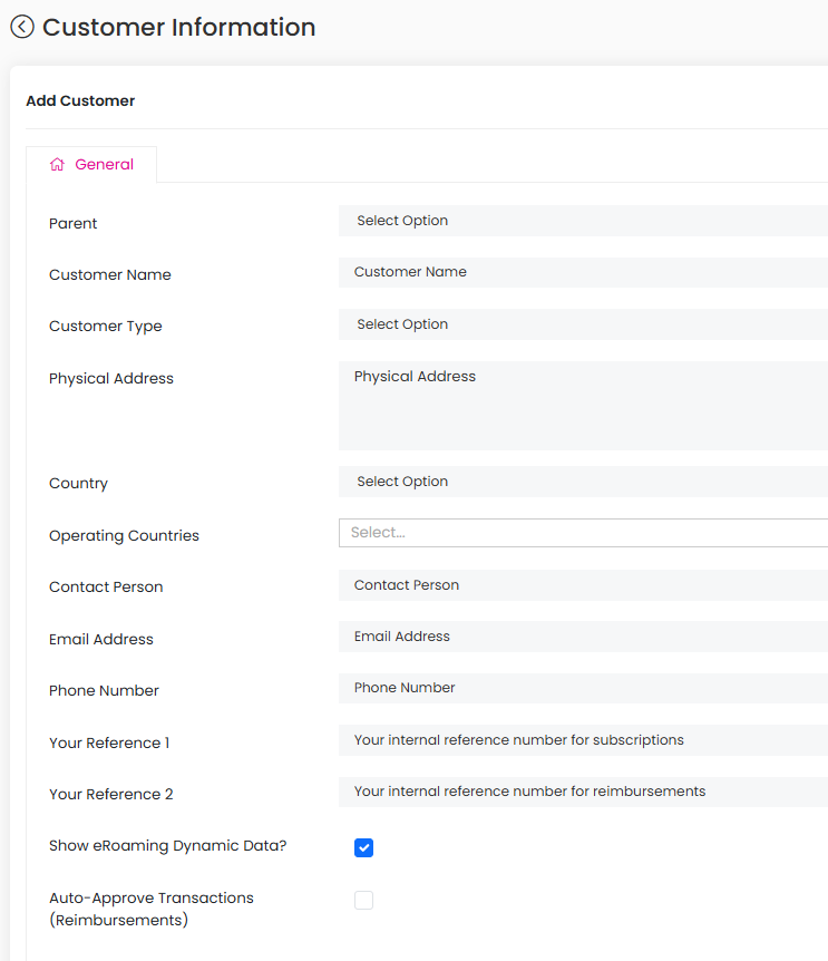 - Physical address: add the full address of the user. Use a new line for street, city, county and postcode